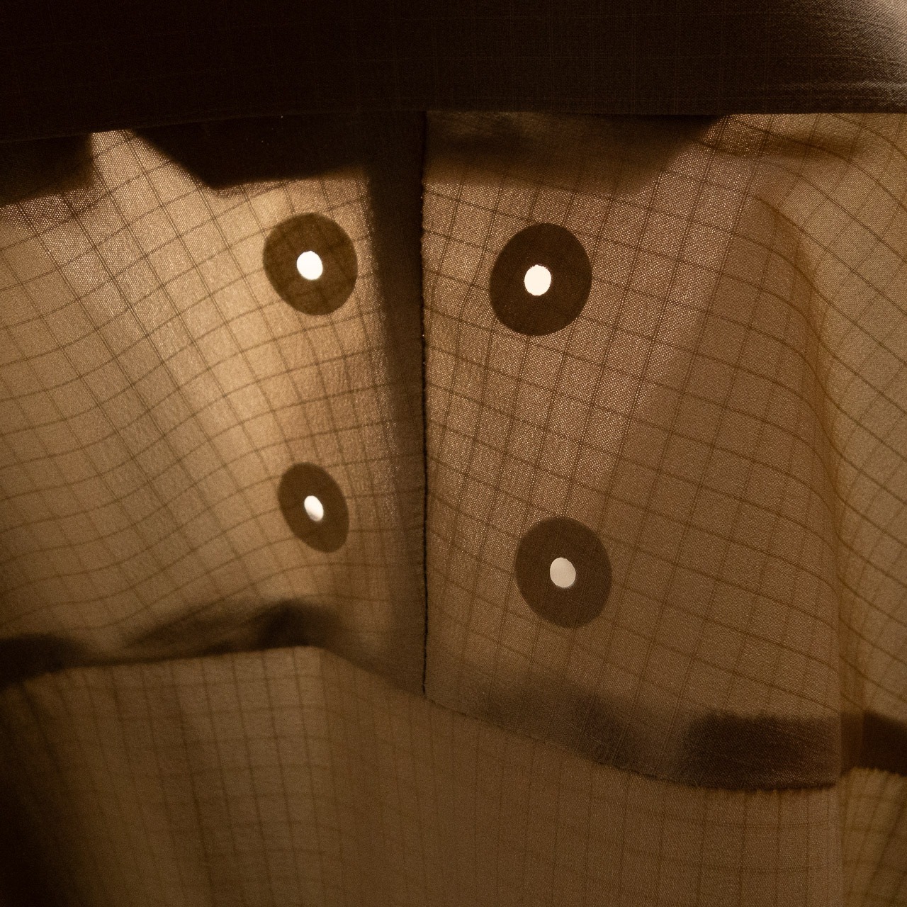 たとえば。素材の生地は20D。透けて見えるほどの薄さに加えて、ストレッチ性は抜群。そのうえシャツ全体をゆったりめのパターンで構成していますから、中にTシャツやベースレイヤーを着てもつっぱり感がありません。まずはこの、ノンストレスな軽い着心地に感動していただきたいと思います。